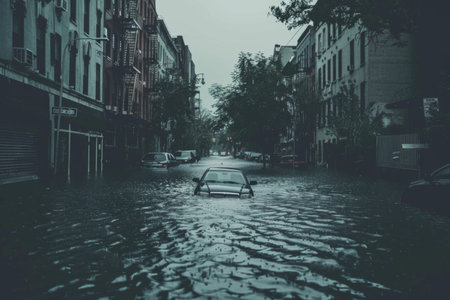 Dark and dramatic flooded street with a trapped car during a natural disaster, showing the devastating impact of climate change
