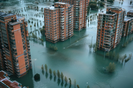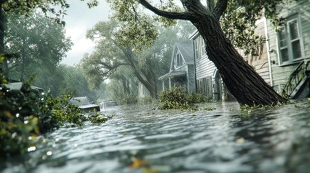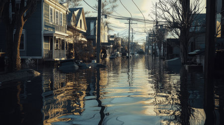 After severe storms, homes stand partially submerged in a flooded neighborhood, illustrating the impact of climate change and nature's power.