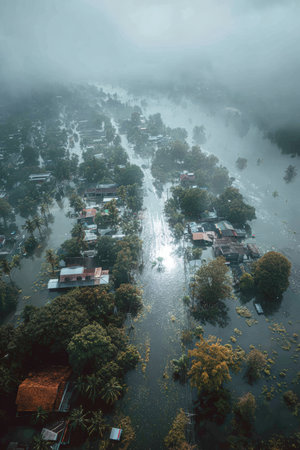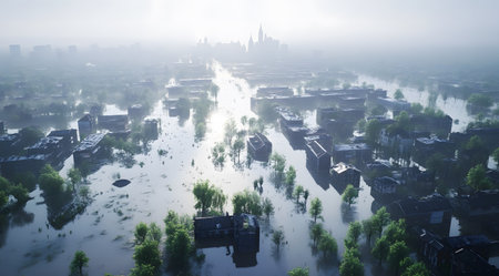 This image captures a surreal flooded village with houses partially submerged in water. The gloomy atmosphere and mist create a haunting yet captivating landscape.