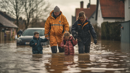 A family navigates through knee-deep floodwaters in a residential neighborhood during a rainstorm, wearing protective gear and holding hands.