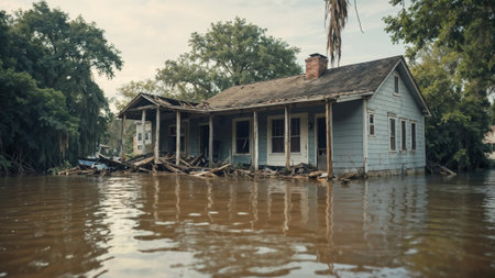 Dilapidated house stands partially submerged in murky floodwaters from hurricane.