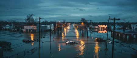 Twilight descends on an urban street transformed into a river by floodwaters, with the ambient glow of city lights reflecting on the water's surface