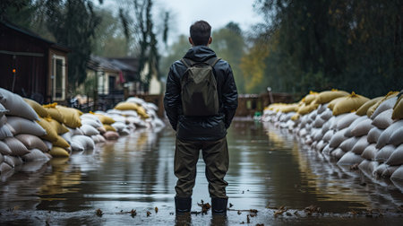A figure contemplates a flooded street, barricaded with sandbags against rising waters