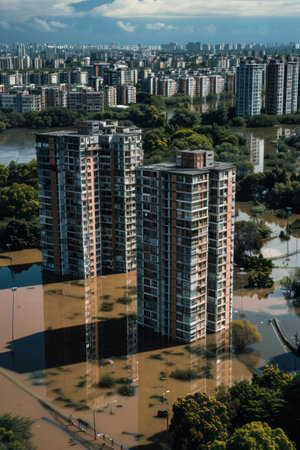 Aerial view of a city flooded after heavy rainfall, showcasing submerged buildings and streets. The scene highlights nature's impact on urban areas.