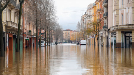 Muddy water flooding a city street reflecting buildings and trees after heavy rain