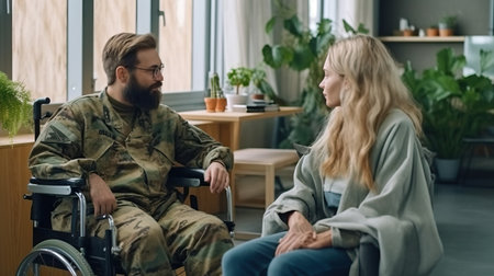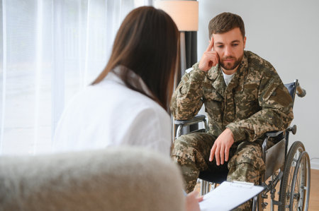 Depressed guy in camouflage uniform paralyzed soldier in wheelchair visiting female psychologist