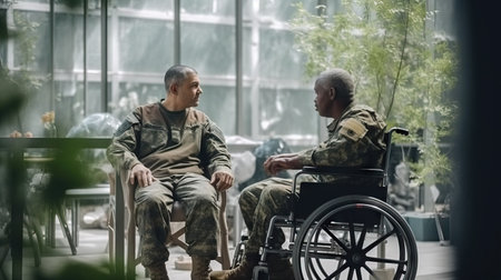 Two men in military uniforms sitting in a wheelchair and talking in a cafe
