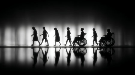 Dramatic silhouettes of individuals walking and in wheelchairs symbolizing movement and diversity