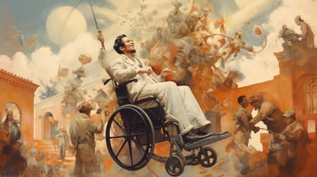 black businessman in a wheelchair embodies success and resilience in the corporate world. Ideal for business stock imagery on diversity and empowerment