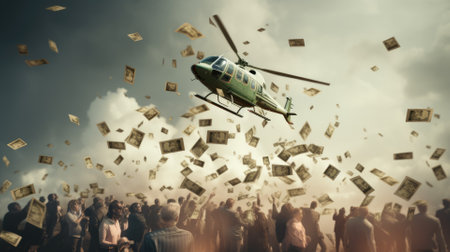 money drop from air to people in the city comeliness, concept of recession rescue by monetization economy