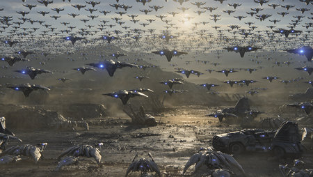 3D illustration. Invasion of alien spaceships. Sky filled with mother ships and small spacecraft.