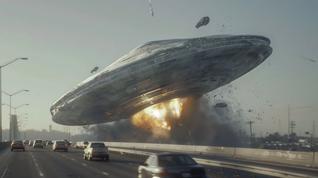 Immerse yourself in a breathtaking sci-fi spectacle as an enigmatic UFO descends from the vastness of the cosmos, casting an ethereal glow upon a barren desert landscape Its enigmatic presence illuminates the clear blue sky with a mesmerizing explosion of light, sparking awe and curiosity This captivating art portrays the visceral encounter between extraterrestrial visitors and our realm, inviting you to ponder the mysteries of the universe AI Generative