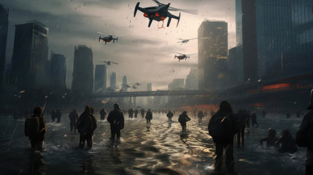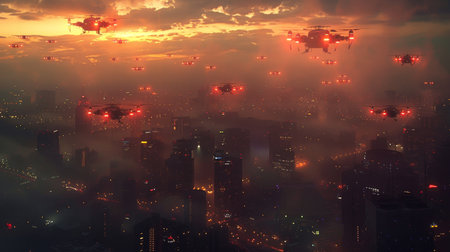 A city is being attacked by a swarm of drones. The drones are flying low over the city, causing destruction and chaos. The sky is orange and the sun is setting, creating a tense and ominous atmosphere