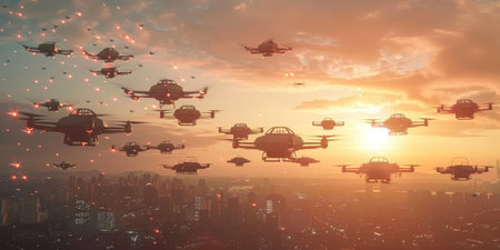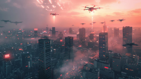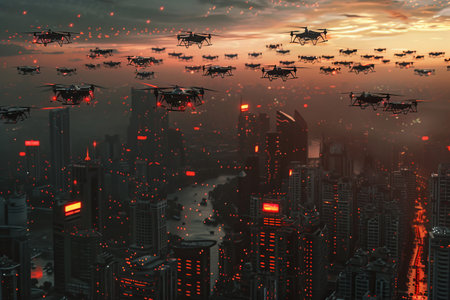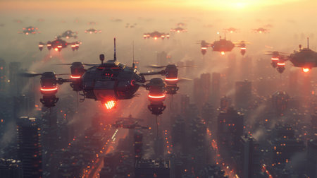 A squadron of unmanned aerial vehicles patrols over the evening city.