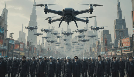 Large group of people wearing suits stands below a swarm of flying drones in a cityscape.