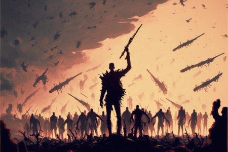 A human brandishing weapons faces a swarm of zombies in a barren, post-apocalyptic setting. Fantasy concept, Illustration painting. Generative AI