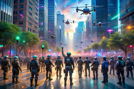A tense moment unfolds as soldiers stand guard near military tanks in a futuristic city.