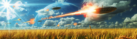 In the cosmic theater of a vast field, a titanic clash unfolds Spaceships, sleek and menacing, engage in a deadly ballet, their laser beams illuminating the void like celestial fireworks Explosions erupt, showering the starscape with fiery debris Amidst the chaos, a solitary fighter pilot, eyes blazing with determination, navigates through the maelstrom, determined to seize victory against overwhelming odds AI Generative