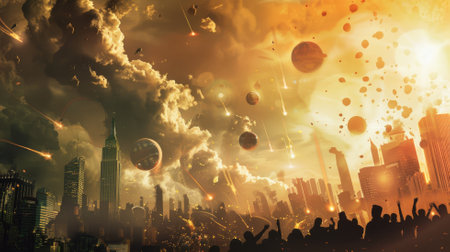 Several alien spaceships are attacking a modern city at sunset, causing widespread destruction and fires, creating a dramatic and apocalyptic scene