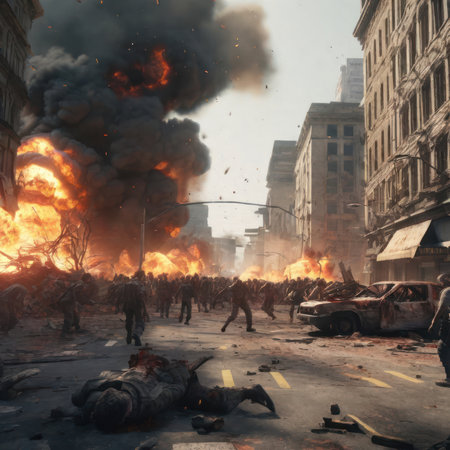 Illustration of a city destroyed by bombs, the effects of war There are zombies all over the city. generative AI