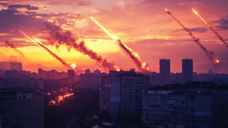 Missiles launch into the sky against a vibrant sunset, casting fiery trails over a city skyline filled with residential and commercial buildings at dusk.