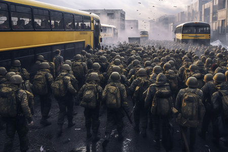 The soldiers walk down a bustling street with multiple buses. AI-generated.