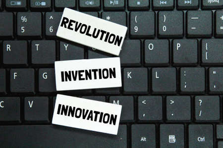 Colored blocks with the words innovation, revolution and evolution