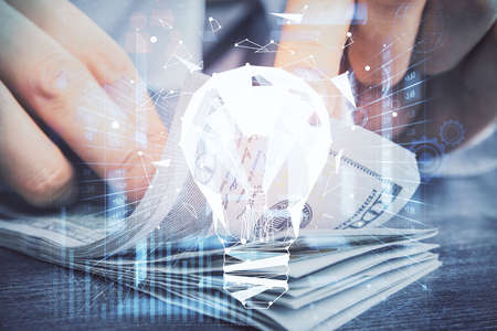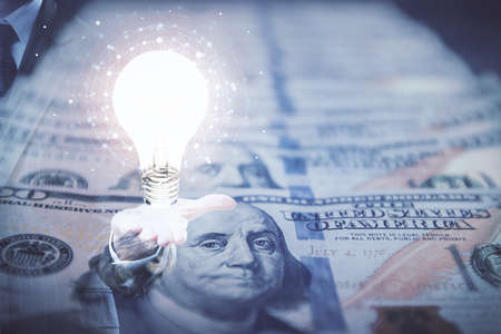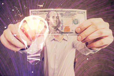 Multi exposure of bulb drawing hologram and USA dollars bills and man hands. Business Idea concept.