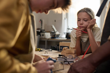 Group of kids working together on project with electric toys and robots at robotics classroom, close up for girl
