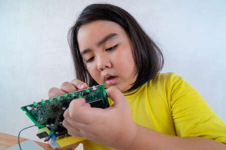 Asian girl is learning about electrical circuits, To be assembled into a robot. STEM Education for kids. Back to school concept