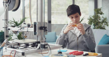 Smart student learning 3D printing at home, he is checking a 3D printed object that he designed