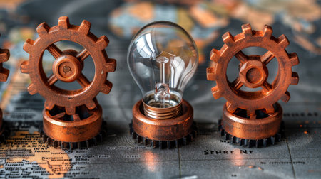 Global collaboration illustrated world map with gears and light bulb signifying travel and unity