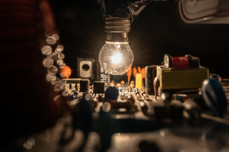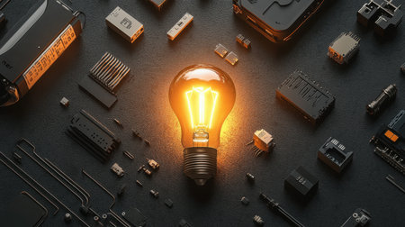 A captivating image featuring a glowing light bulb at the center, surrounded by various electronic components on a dark background, representing innovation and creativity in technology.