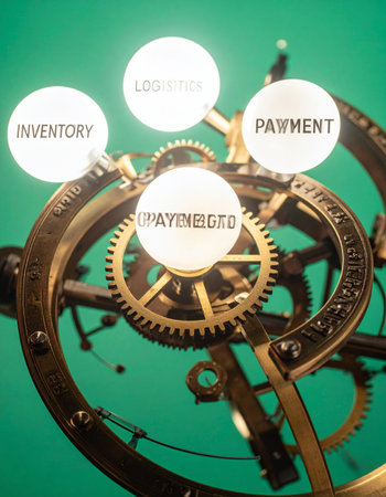 A complex, steampunk-inspired machine with glowing orbs representing key business functions like logistics, payment, and inventory.