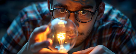 A young man closely examines a glowing lightbulb, casting a soft light in a dimly lit environment.