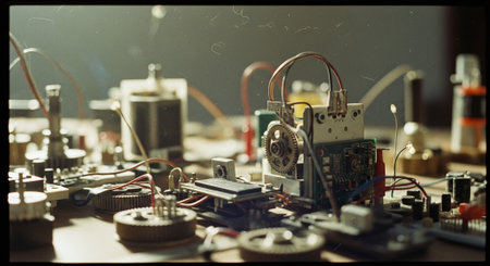 An electronic circuit board and various components are showcased, illuminated by a combination of red and blue light. The image highlights a complex arrangement of wires, panels, and equipment, indicating a possible laboratory or workshop setting. This composition may be suitable for illustrating technology, innovation, or research concepts in commercial contexts.