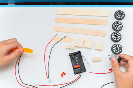 Construction of electronic car with microcontroller. Collective creation of diy electronics, modern technologies, innovation and science concept