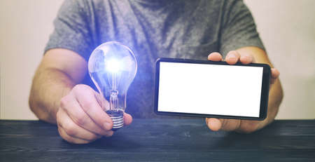 Mockup phone. A man holding a phone with a white screen and a light bulb, investment in ideas, investment in a startup.