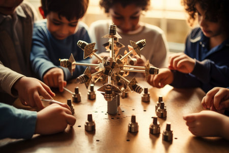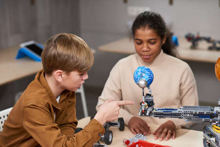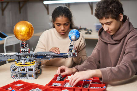 Two teenage kids building electric robots while enjoying engineering class in school, copy space