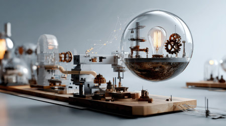 This visually striking image features a steampunk-inspired machine with intricate gears and glass domes, illustrating the fusion of art and technology.