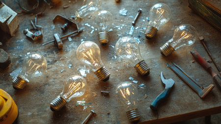 A creative arrangement of broken light bulbs scattered on a table, juxtaposed with tools, symbolizing innovation and the process of making new ideas
