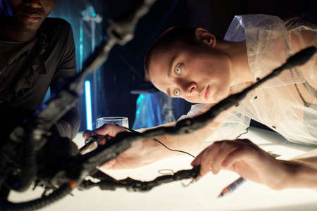 Cyberpunk woman working with tools and connecting the robotic arm to the body of man at the table