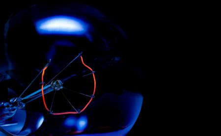 Glowing purple electricity bolts in glass tubes in a science lab.