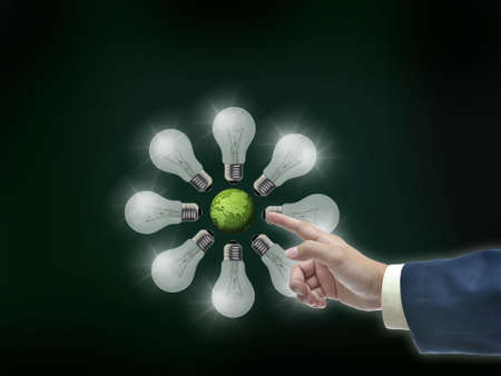Hand holding bulb with recycle symbol inside isolate on black background.