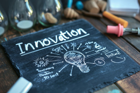Closeup image showcasing a black chalkboard with the word 'innovation' and associated creative doodles in a business setting