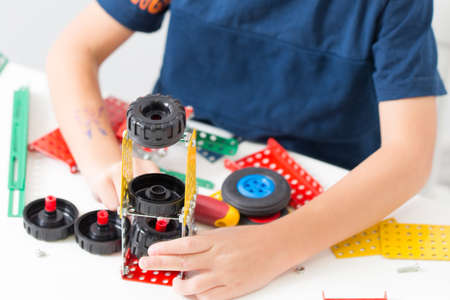 Kid collects robot from plastics details and programmed on tablet, robotics.