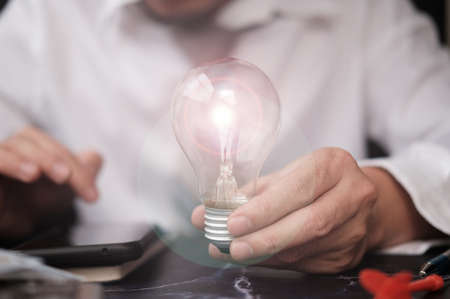 A man holds a glowing light bulb, representing new ideas and inspiration. The image is perfect for business and innovation concepts.