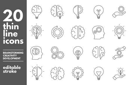 Brainstorm thin line icons set. Artificial light, brain, lightbulb, creative, Development, knowledge, brainstorming, brainstorm solution Editable stroke. Vector Illustration