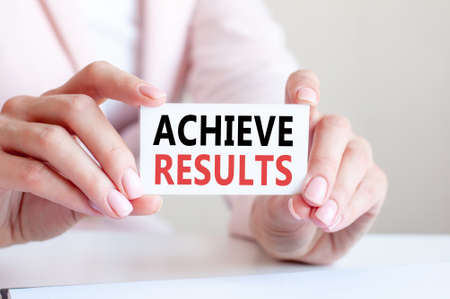 achieve results is written on a white business card in a woman's hands. Pink background. Business and advertising concept