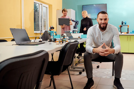 A man sitting in a robotics laboratory while his colleagues in the background test new, cutting edge robotic inventions.
